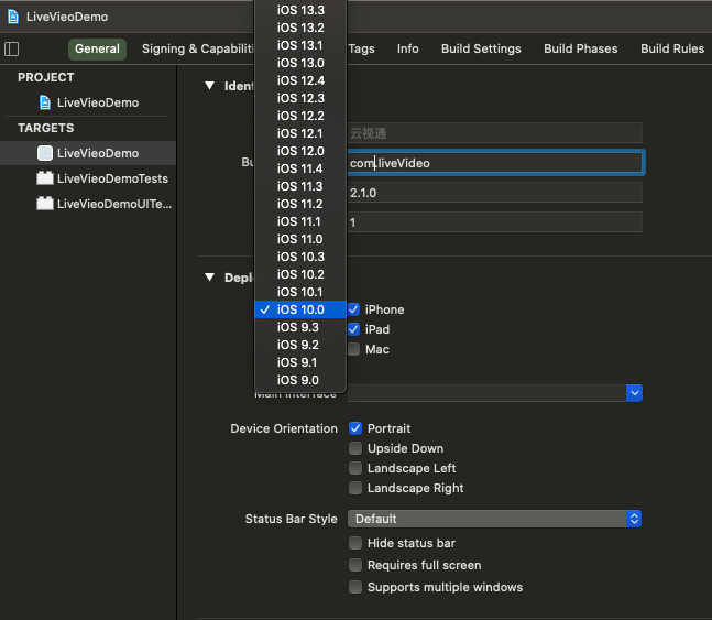 5.2、打开 Xcode,选择:项目 TARGET -> General -> Deployment Target,设置 10.0 及以上版本。 设置系统